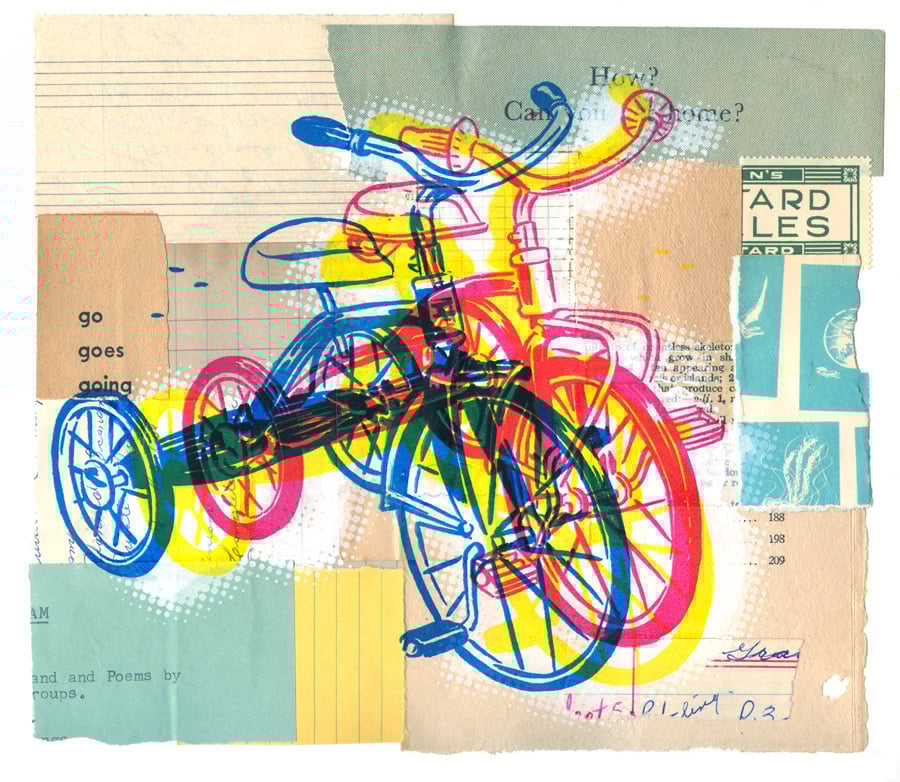 Collage and screen print. The collage elements are built by hand and vary from piece to piece. Screen printed elements are the same through the series.